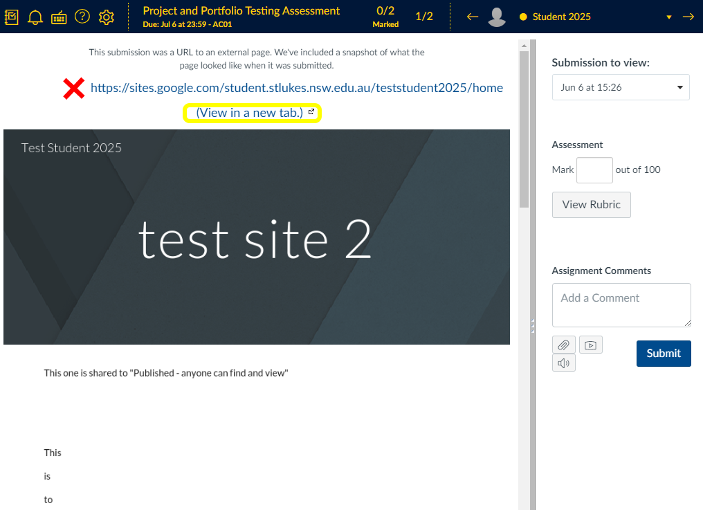 1. Go into the assignment and select SpeedGrader. You will see a snapshot of the site as shown below. This snapshot is of the site at the time the assignment was submitted. You can scroll down and see the content on the page but if there are any links these will not work.