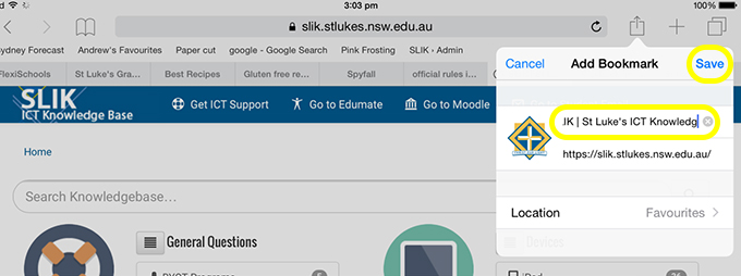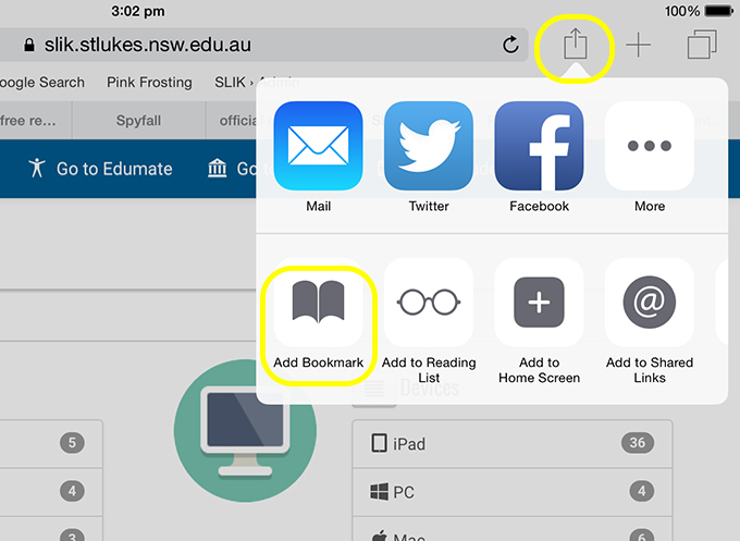 - Press the Options icon to the right of the address bar. Then choose Add Bookmark
