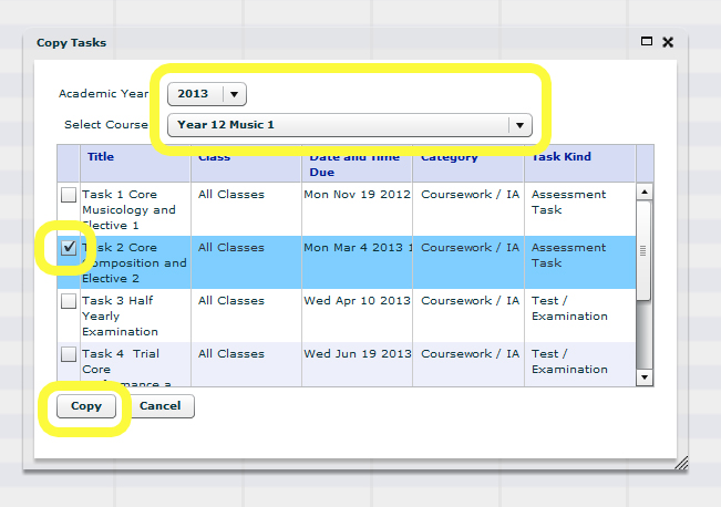- Select the Academic Year and Course that you want to copy the task from, select the task or tasks then select Copy