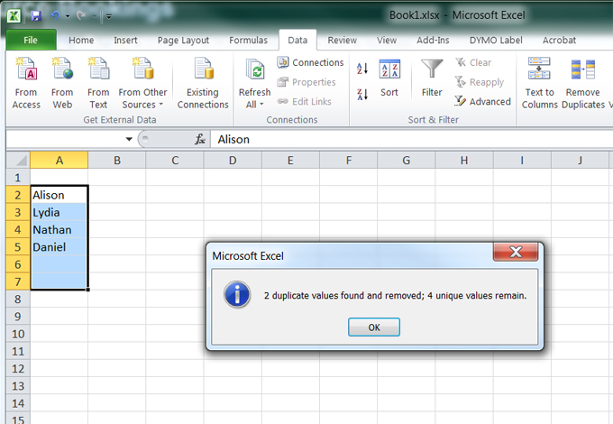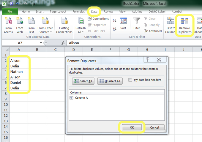 1. Highlight the range of cells with duplicated data. Select Data, then Remove Duplicates, then select OK.
