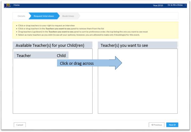Click or drag the “teacher/child name box” from the left to the right. Note, on the right, you can order the names of the teachers in preference order.