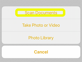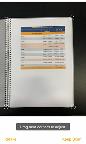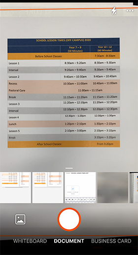 Point your device’s camera at the document you want to scan and select the format that best matches the item you are scanning (ie: whiteboard, document, business card, or photo). Turn the flash on or off or set it to automatic. To best capture the item, position your device so the border frames it and then snap the picture.
