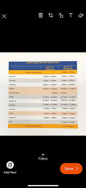 Once you have taken the photo you can edit it by pinching with your fingers, using the crop tool, adding text etc. When you are finished editing you can select Add New to capture a subsequent page of your document or select Done if you have finished.