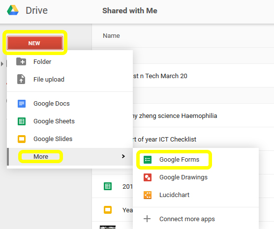 9. To create a Google Form, select NEW, then More then choose Google Forms.