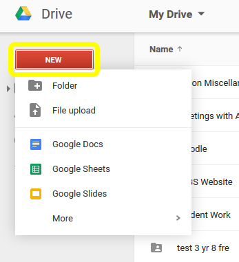 1. Select NEW. From here you can create Google Docs, Google Sheets, Google Slides or more. You can also create a folder and upload a file.