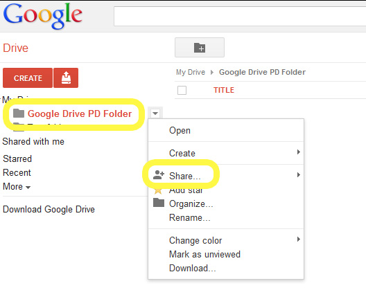 6. Your new folder will be listed under My Drive. If you right click on the folder name a drop down menu will appear. To share a folder with a colleague select Share.