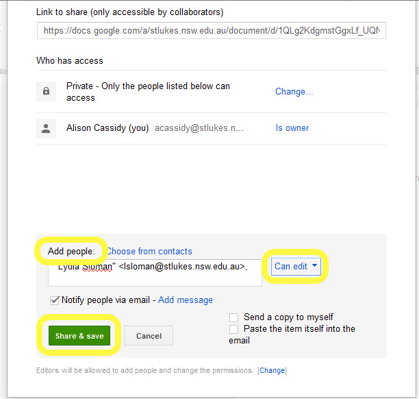 3. The following screen will appear. Add a colleague to share your document with. Make sure that Can edit is ticked, then select Share & save