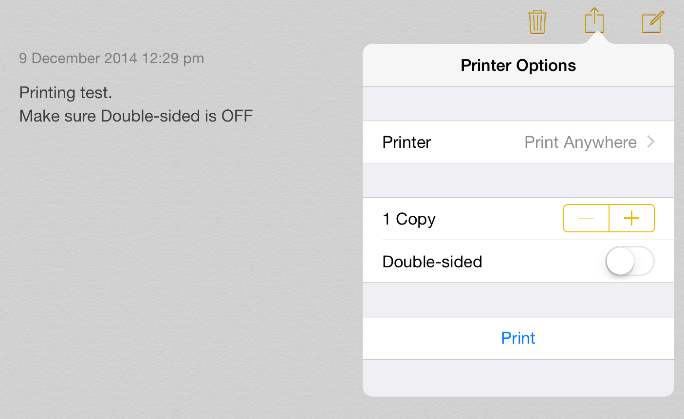 - Open the document you wish to print and locate the print function – this will vary according to which app you are using. The following image is of a document in the Notes app.