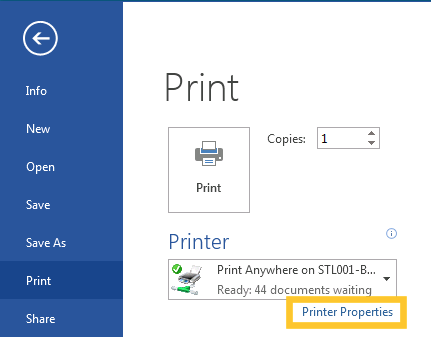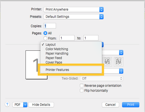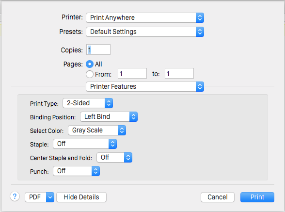 - Select the printer called “Print Anywhere” and the number of copies required. Make sure that you turn Double-sided OFF.