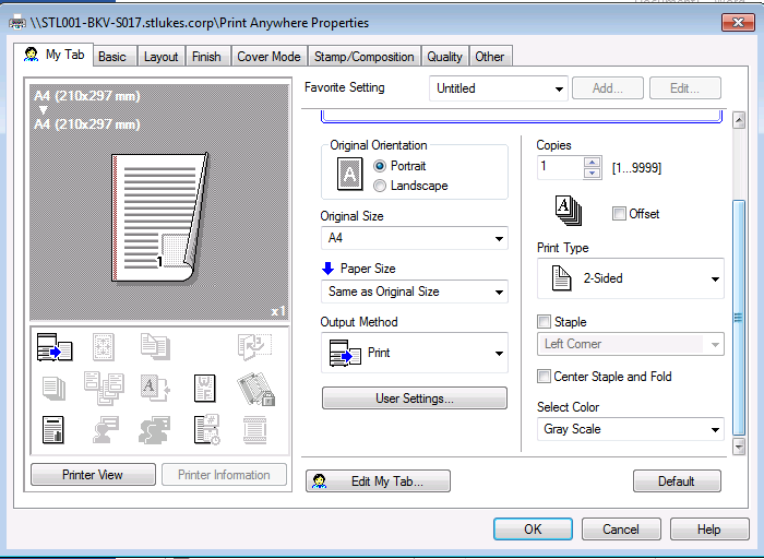 The default for printing at St Luke’s is A4, Double-sided, Black/White. These options can be changed in the Printer Settings/Printer Features areas on your device when printing (not applicable for iPads)